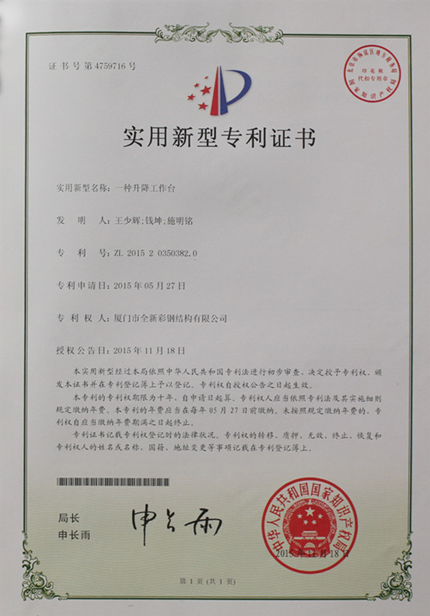 लिफ्ट प्लेटफॉर्म का पेटेंट प्रमाणपत्र