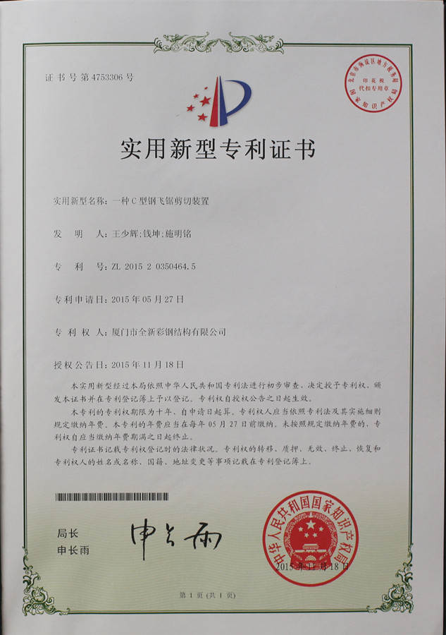 आरा कटर का पेटेंट प्रमाणपत्र